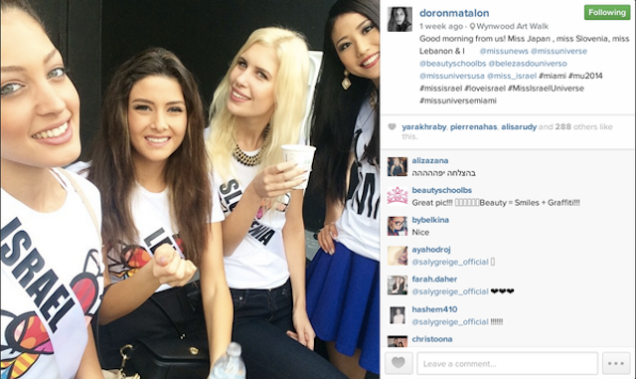 Miss Líbano, Saly Griege, sólo quería sacarse una foto con Miss Japón y Miss Eslovenia pero la hija de puta de Miss Israel, Dorón Matalon, vino y les cagó la foto, o al menos es lo que dijo después de ser bardeada por todos los medios de su país. Es difícil de creer la versión de la libanesa porque está claro que la israelí sacó la selfie dada la posición de la misma. Amén del hecho de que empíricamente todas parecen contentas de estar en la foto.