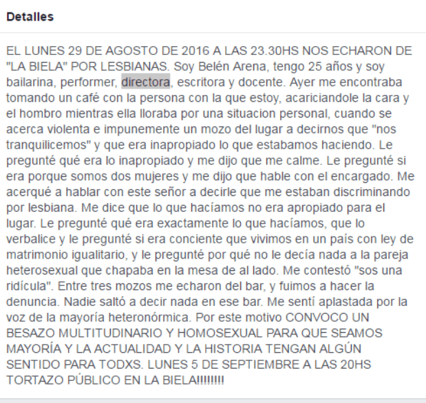 escribió Belén Arena, convocando al evento ‘ESCRACHE PUBLICO «TORTAZO» EN EL BAR LA BIELA‘ que fue compartido 18 mil veces, «interesó» a 11 mil perfiles de Facebook, de los cuáles «fueron» siete mil doscientos «Asistieron» 19 de mis 1,185 amigos.