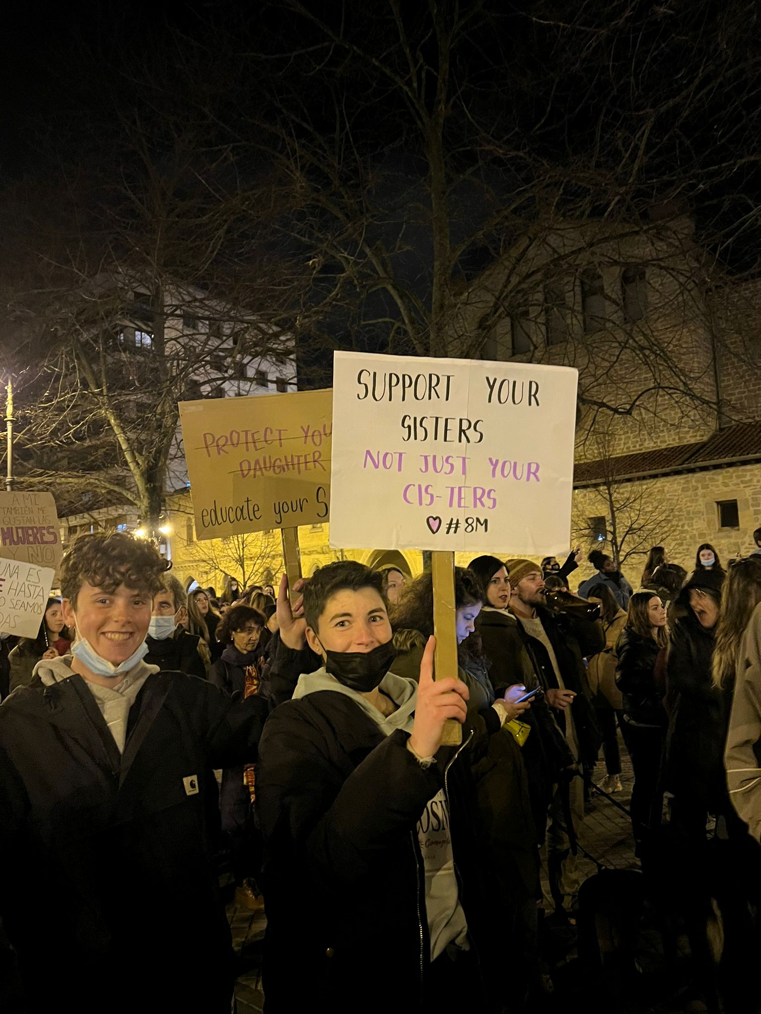 La noche se había despejado y el camino a la marcha lo hicimos en el aire. En la plaza no había colores y nunca había visto tantos hombres en una marcha feminista. Algunos mayores con chapelas (las boinas vascas, algunas muy parecidas a las nuestras), otros jóvenes y otros con niños de la mano. Había seriedad, silencio, camperas abrigadas y como isletas en un mar que caminaba, había alguna que otra risa, algún grupo humano que había llevado un parlante. Pero faltaba la alegría. Faltaba sin dudas, la fiesta feminista. Me faltaban los abrazos, la risa, la cerveza, los colores y el glitter. No encontraba las rondas de amigas y me preguntaba, mientras escuchaba las marcadas “k”s y “x”s del euskera, si la fiesta feminista que siempre viví en Argentina sería la misma si la abriénsemos a los hombres, con chapela o sin chapela. En la marcha faltaban cosas pero había otras: mujeres de otras etnias, pedidos por Palestina, por Ucrania, por mujeres desaparecidas que aparecían en carteles levantados, con sonrisas y hijabs en la cabeza. También una banda abolicionista muy marcada, que en un momento pasó cerca de donde yo estaba y un hombre les gritó “¡terfs!” y se agachó rápido. Para mi sorpresa, no pasó nada. No entiendo cómo funciona la no-confrontabilidad en esta tierra.
