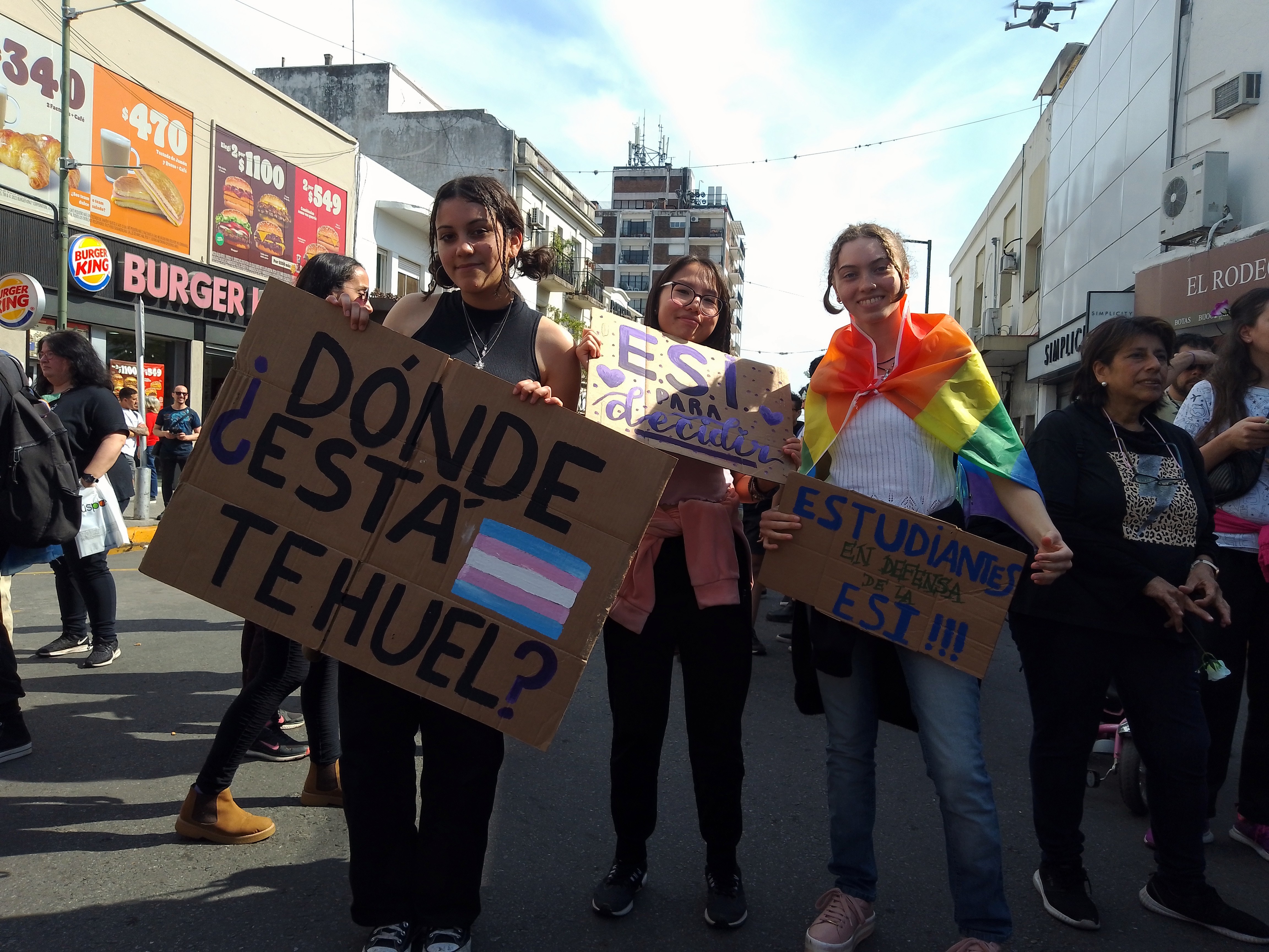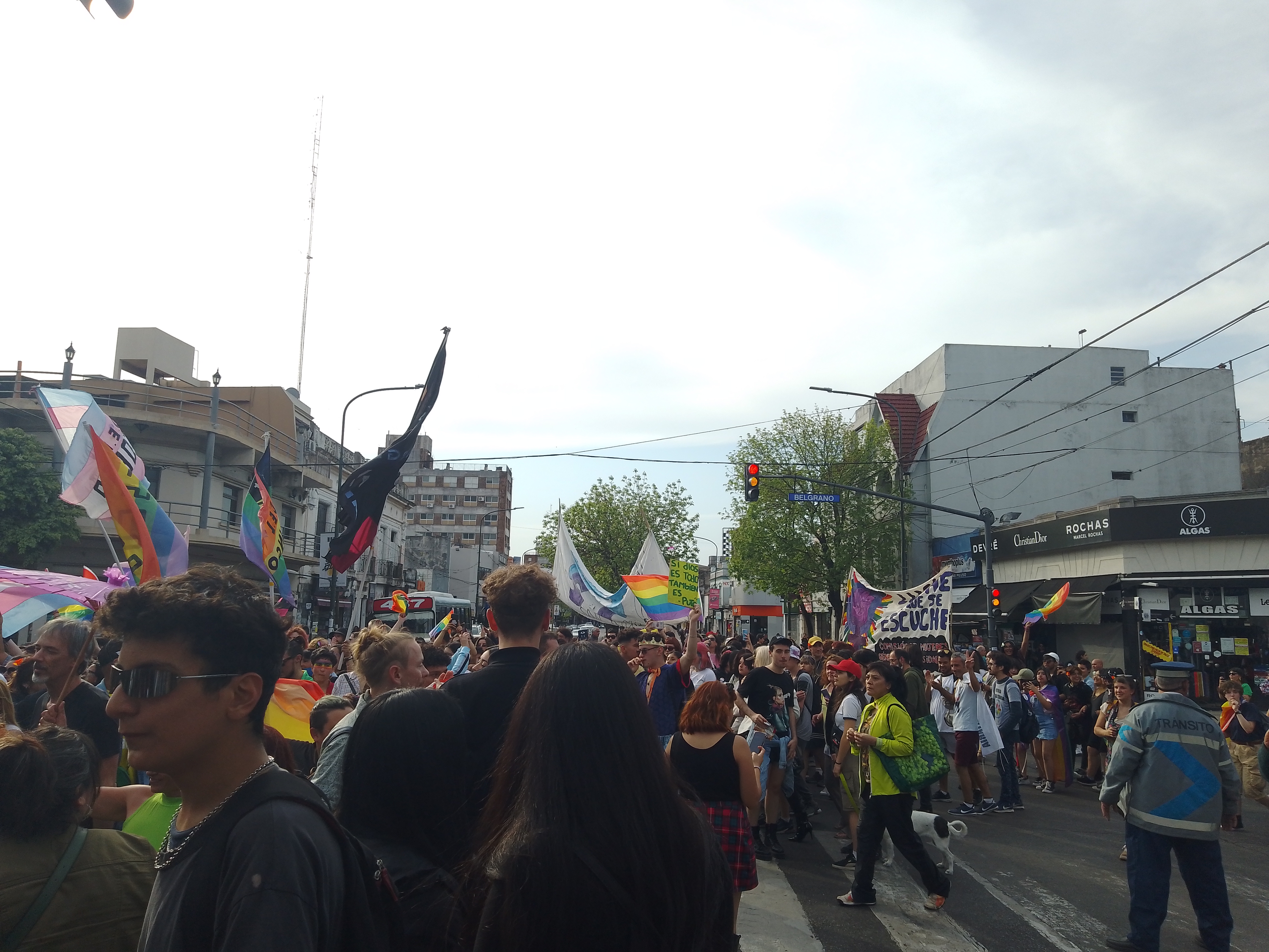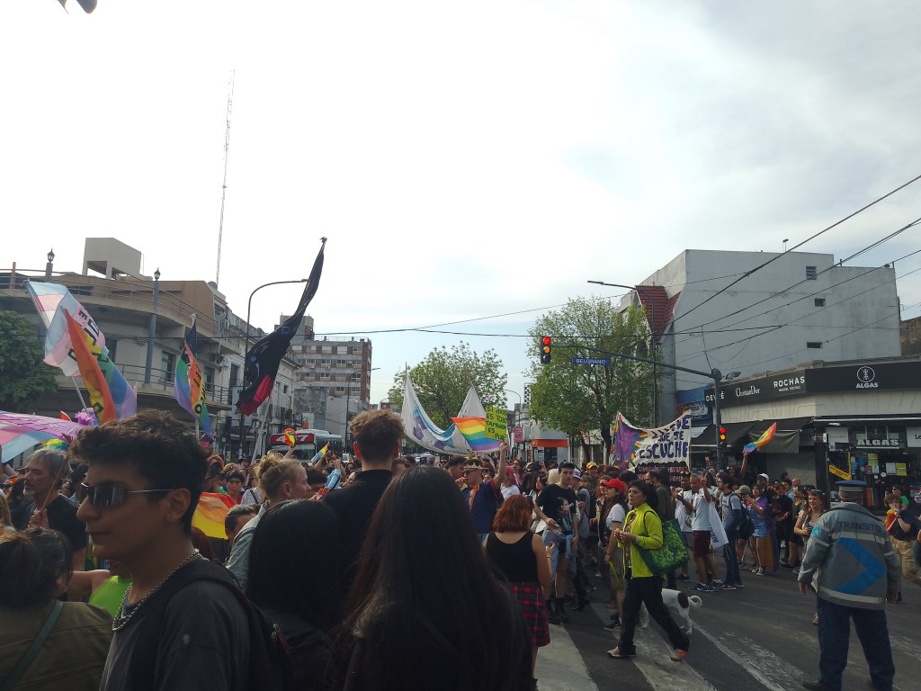 marchar por Belgrano al grito de donde está Tehuel y que al calabozo no volvemos nunca más con las y los vendedores mirandonos con curiosidad y atención, dar la vueltecita por Centenario Y ESTAR CAMINANDO SOBRE LA AVENIDA, con bengalas, con silbatos, con plumas, con glitter, en tetas hasta llegar a la caja de ladrillos que es la Municipalidad. Y como está claro que no todo el mundo ocupa el espacio de la misma manera, se dieron en el mismo espacio espacio físico la pasada de 4×4 con bocinas por la Avenida Márquez de los rugbiers del SIC y el CASI que venían de enfrentarse con nuestra movilización.