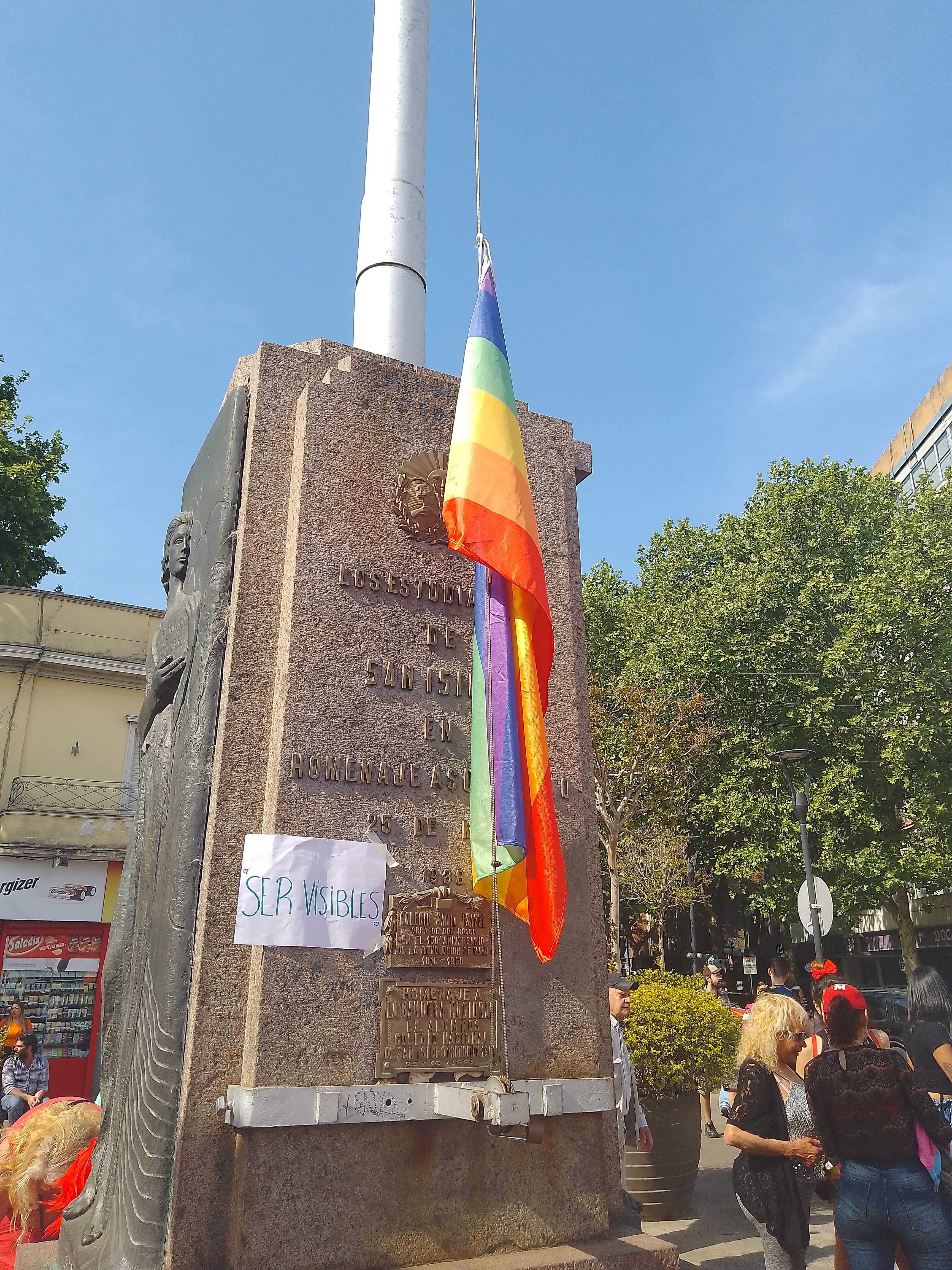 La fiesta empezaba en la plazoleta del mástil de San Isidro, a escasas cuadras de la Cátedral, que rápidamente fue embellecida con un cartelito casero que llamaba a ser visibles y la bandera LGTBIQ con la intención que flameara para todxs lxs presentes. Mientras los chicos de Ciervos Pampa (primer club de rugby de diversidad sexual) arrojaban la pelota en la capital argentina del rugby, desde la radio abierta pasaron distintos representantes de los sectores que motorizaron la marcha, marcando el pulso de lo que sería el desfile por la calle Belgrano hasta la Municipalidad a siete cuadras.